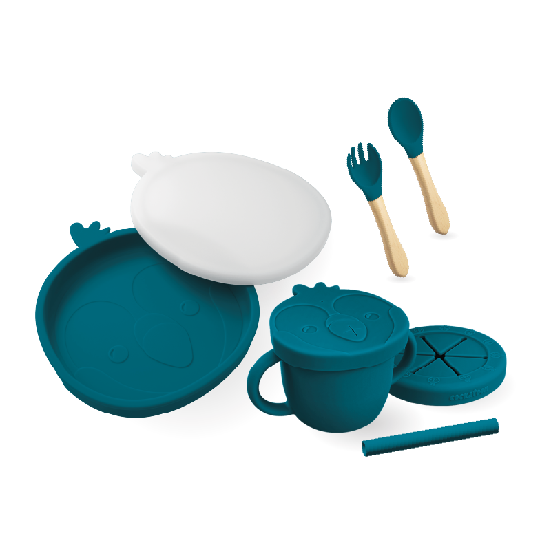 - أبطال التغذية الذاتية: شجعوا التغذية الذاتية مع الملعقة والشوكة السيليكونية الناعمة التي تكون لطيفة على اللثة وسهلة الإمساك للأيدي الصغيرة.